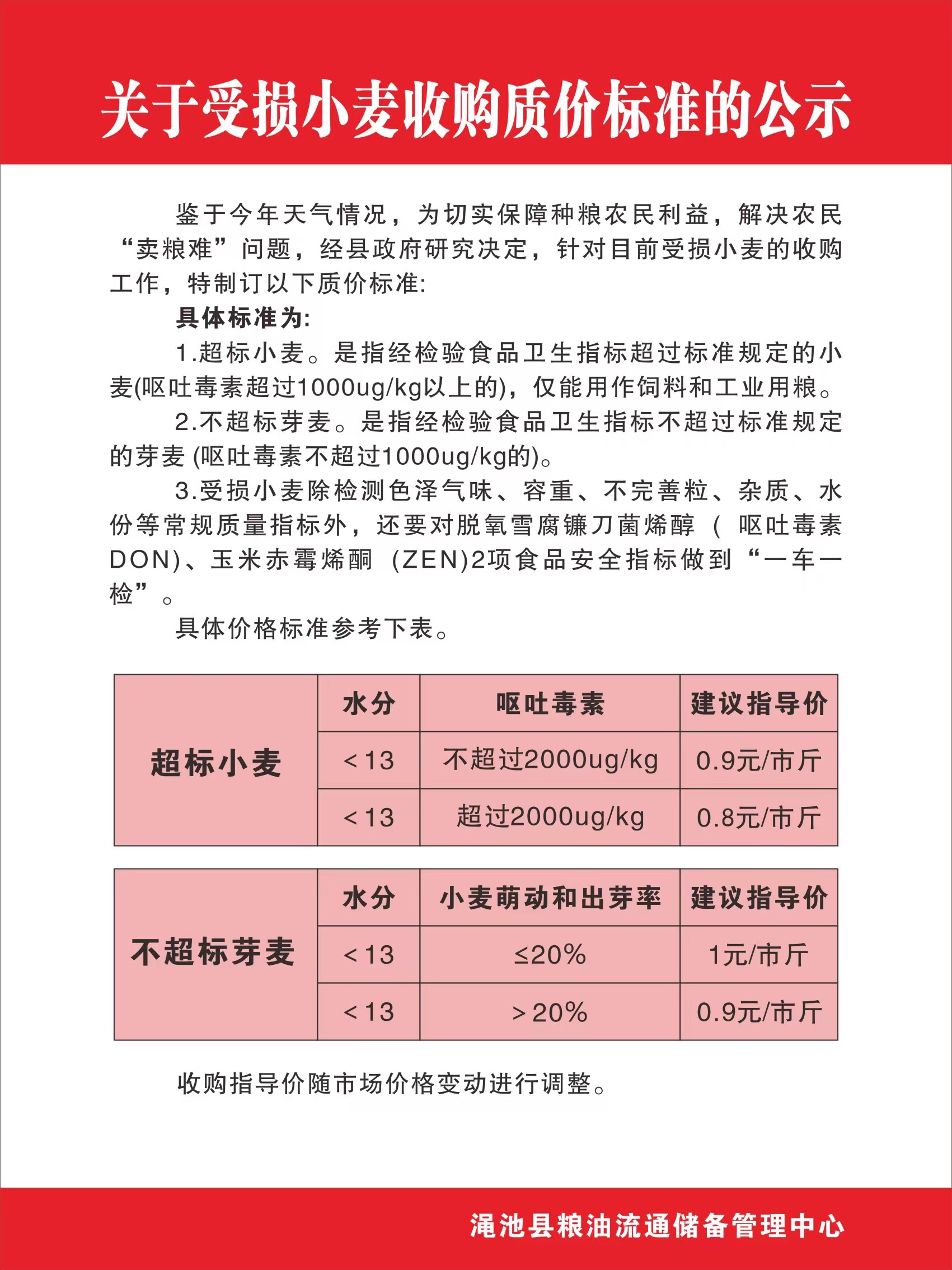 關(guān)于受損小麥?zhǔn)召?gòu)質(zhì)價(jià)標(biāo)準(zhǔn)的公示