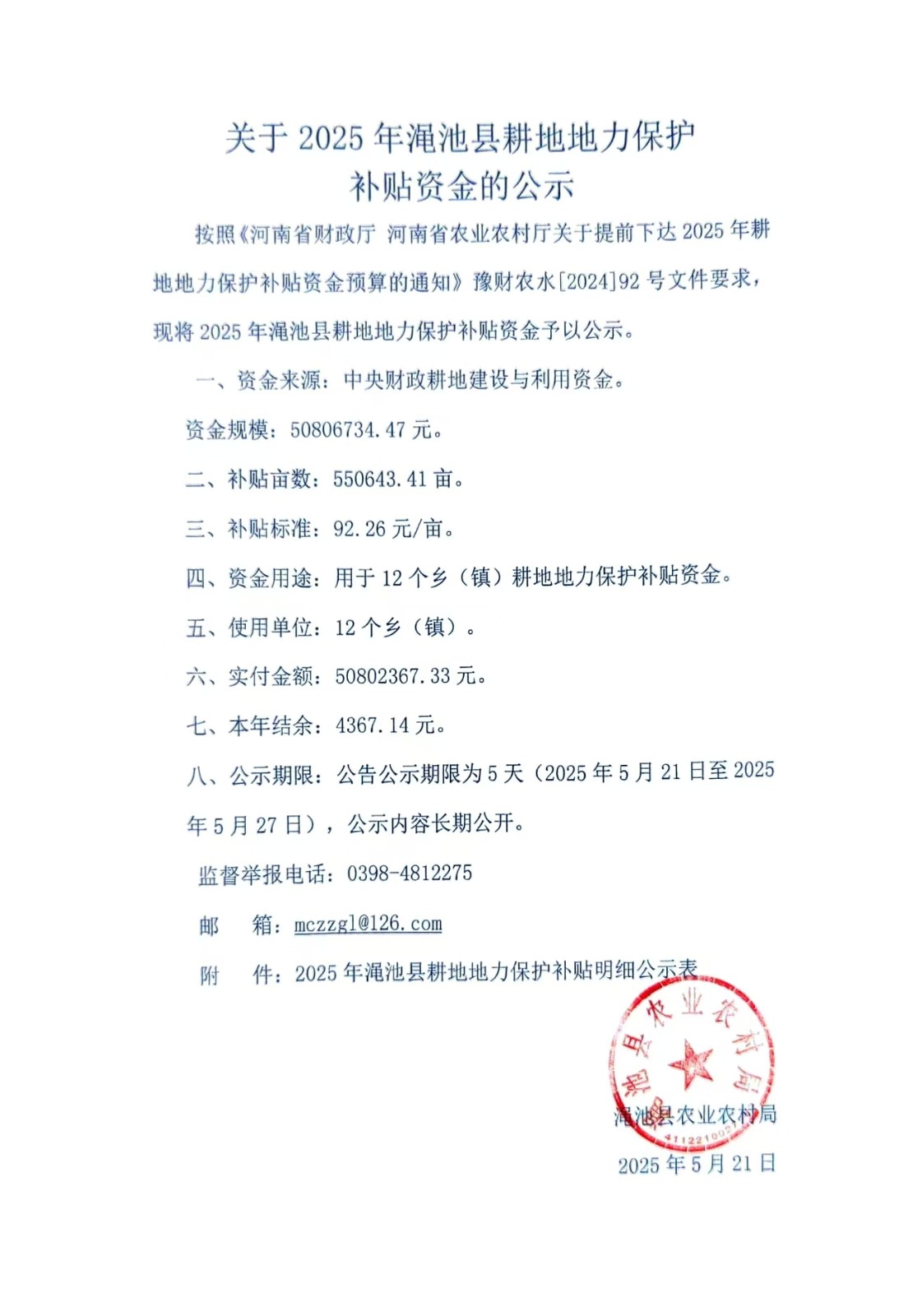 關(guān)于2025年澠池縣耕地地力保護補貼資金的請示